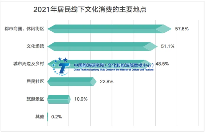 本地休闲和近程出游模式主导下,国内居民更多关注身边的文化消费空间与体验内容。专项调研数据显示,2021年都市商圈和文化休闲街区(57.6%)、文化场馆(51.1%)、城市周边及乡村(48.5%)为主要的文化消费地点。常态化防控形势下,人们对于身边的美好生活更加关注,对于文化消费的内容认同感、趣味可玩性、互动体验感等需求不断升级。不断涌现并更新迭代的新兴商业综合体、城市会客厅、文博场馆、社区文化生活圈等成为国内文化消费的主要场景。