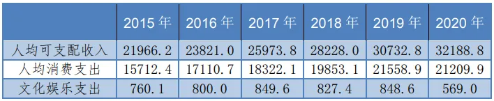表1 2015-2020年居民人均可支配收入与文化娱乐消费支出