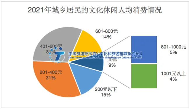 在对2021年文化休闲体验的人均消费(不含交通住宿等费用)的调研中,城乡居民文化消费区间主要集中在201-400元和401-600元。