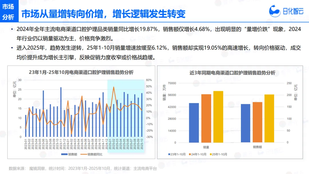 2024年全年主流电商渠道口腔护理品类销量同比增长19.87%,销售额仅增长4.68%,出现明显的“量增价跌”现象,2024年行业仍以销量驱动为主,价格竞争激烈。