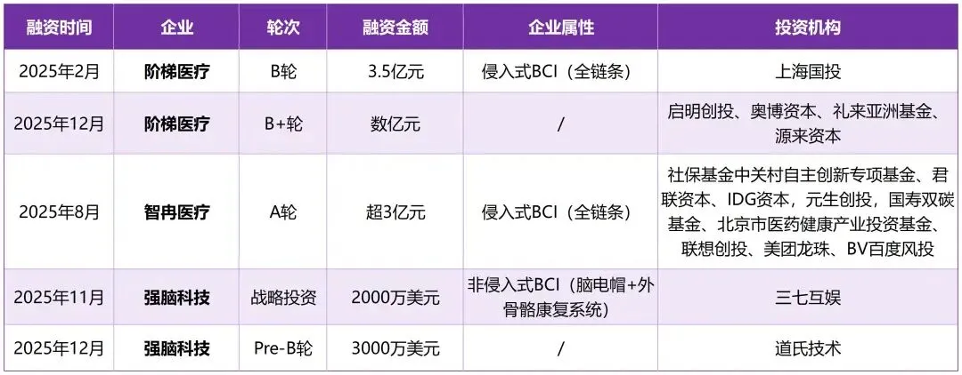 而从融资金额看,侵入式企业单笔融资金额要高于非侵入式。2025年,共5次融资单笔金额在1亿元以上,共涉及3家企业,其中2家为侵入式技术,为阶梯医疗、智冉医疗;1家为非侵入式技术,为强脑科技。