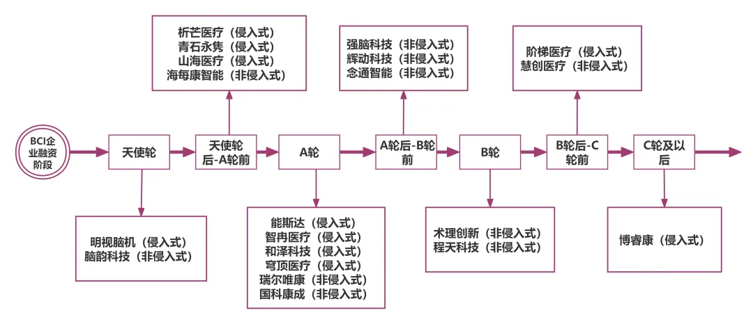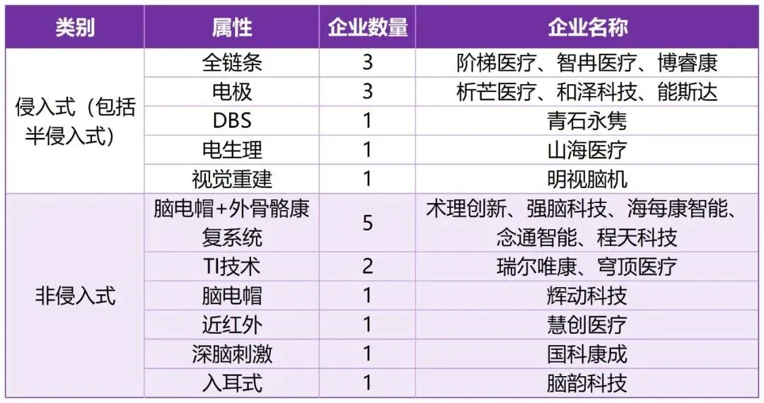 BCI企业所涉类别较广,侵入式领域,既包括电极+系统集成+临床转化全链条的企业,也有深耕电极、DBS、电生理、视觉重建等领域企业;非侵入式领域,既包括脑电帽+外骨骼康复系统的企业,也包括深耕TI、近红外、深脑刺激、入耳式等技术的企业。