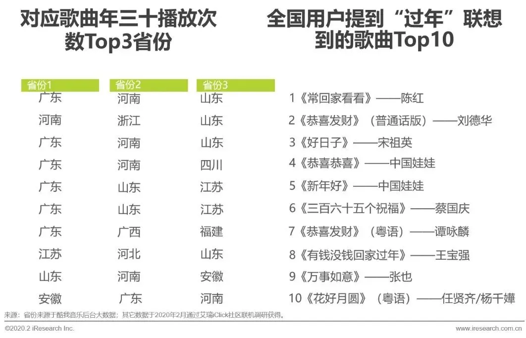 根据调研数据,提到过年人们联想到的排名第一的歌曲为《常回家看看》,再次凸显了春节与团圆的强关联性,同时这首歌曲播放次数最多的省份为广东省。此外《恭喜发财》与《好日子》等喜庆曲目也位于前列。其次可以看到广东省为多首春节热歌(不论粤语或普通话版本)播放次数第一的省份,一定程度反应出当地用户在年节喜欢播放喜庆歌曲的特点。