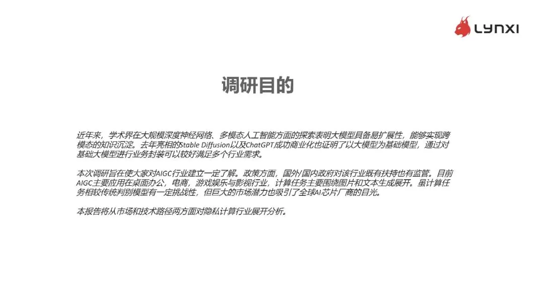 近年来,学术界在大规模深度神经网络、多模态人工智能方面的探索表明大模型具备易扩展性,能够实现跨模态的知识沉淀。去年亮相的Stable Diffusion以及ChatGPT成功商业化也证明了以大模型为基础模型,通过对基础大模型进行业务封装可以较好满足多个行业需求。 本次调研旨在使大家对AIGC行业建立一定了解。政策方面,国外/国内政府对该行业既有扶持也有监管。目前AIGC主要应用在桌面办公,电商,游戏娱乐与影视行业,计算任务主要围绕图片和文本生成展开。虽计算任务相较传统判别模型有一定挑战性,但巨大的市场潜力也吸引了全球AI芯片厂商的目光。 本报告将从市场和技术路径两方面对隐私计算行业展开分析。