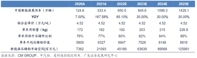 考虑到一体化压铸的技术、资金门槛较高,认为该市场将首先在新能源乘用车中逐步推广。随着一体化压铸优势逐步凸显与技术的推广,认为一方面汽车用压铸铝数将不断增加,同时,随着一体化压铸工艺渗透率的提升,单车一体化压铸件的价值量也会逐步提升。量价齐飞的逻辑支撑一体化压铸市场空间迅速扩大。根据国内新能源乘用车、单车用铝量、压铸铝占汽车用铝比例数据先推算出国内新能源压铸用铝量计算显示2025年新能源汽车铝压铸市场规模达1259.91亿元。