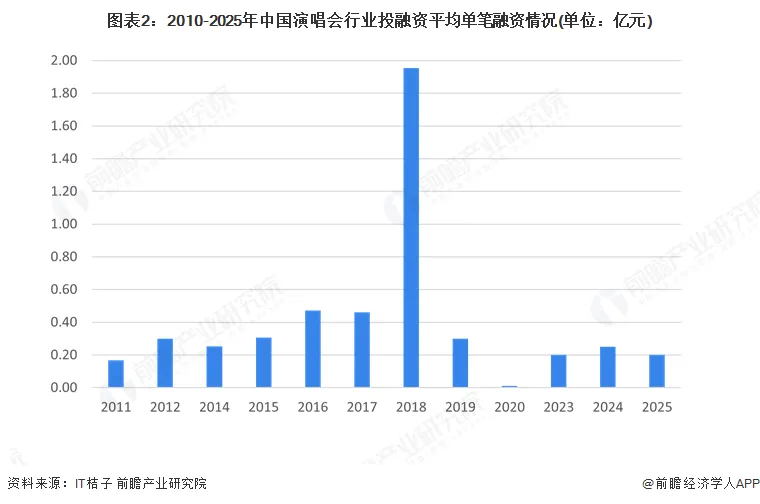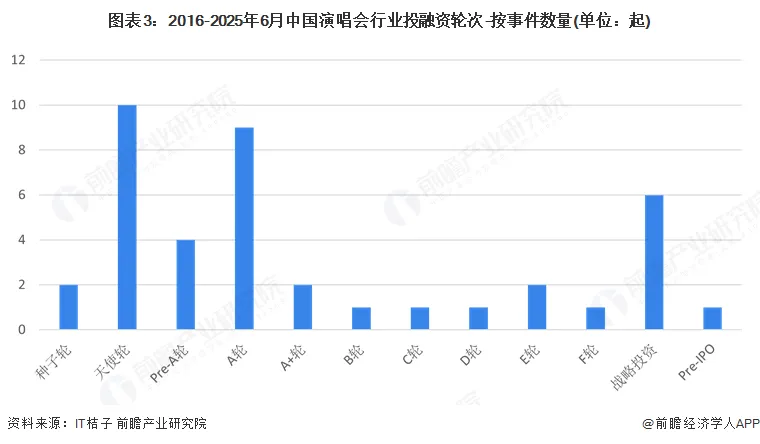 从2016年至2025年6月的中国演唱会行业投融资数据来看,早期轮次占据主导地位。其中,天使轮和A轮融资事件数量最多,分别为10起和9起,表明行业处于初创阶段,大量企业处于早期发展期,资本市场对初创企业的支持力度较大。此外,战略投资事件数量达到6起,显示出行业对大型企业或资本方的战略布局需求较高。相比之下,B轮及以后的中后期融资事件数量较少,尤其是C轮、D轮及更高轮次的融资事件仅占少数,反映出行业整体成熟度较低,企业从初创阶段向成熟阶段的过渡仍面临较大挑战。