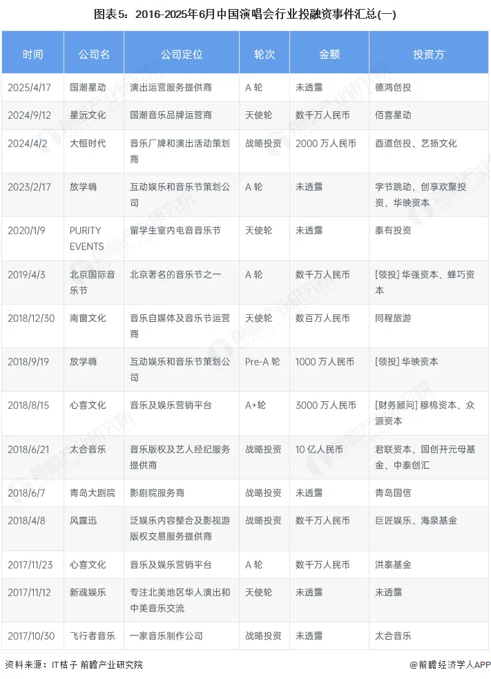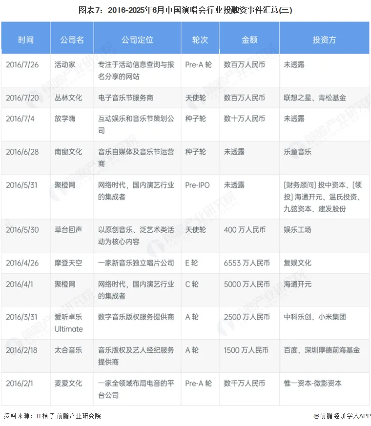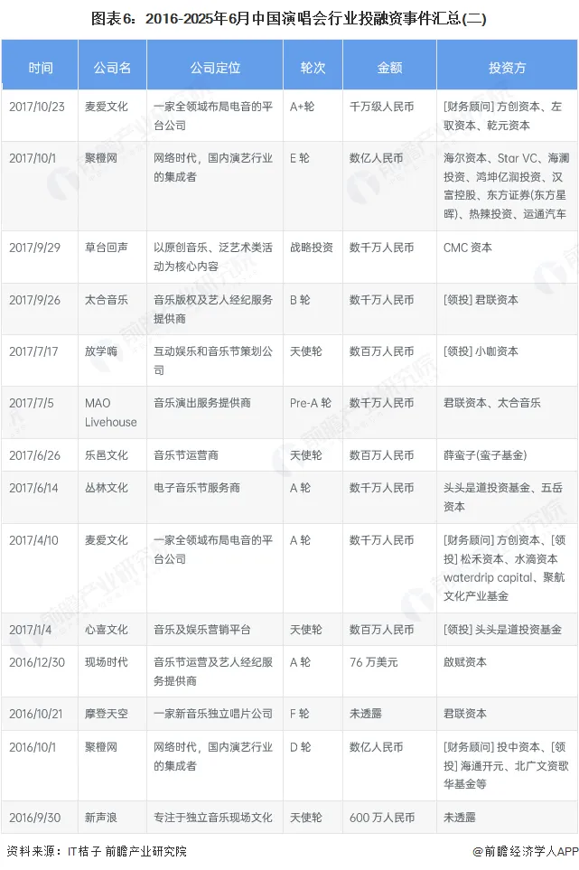 2016年至2025年6月6日,近十年演唱会行业的主要投融资事件如下所示: