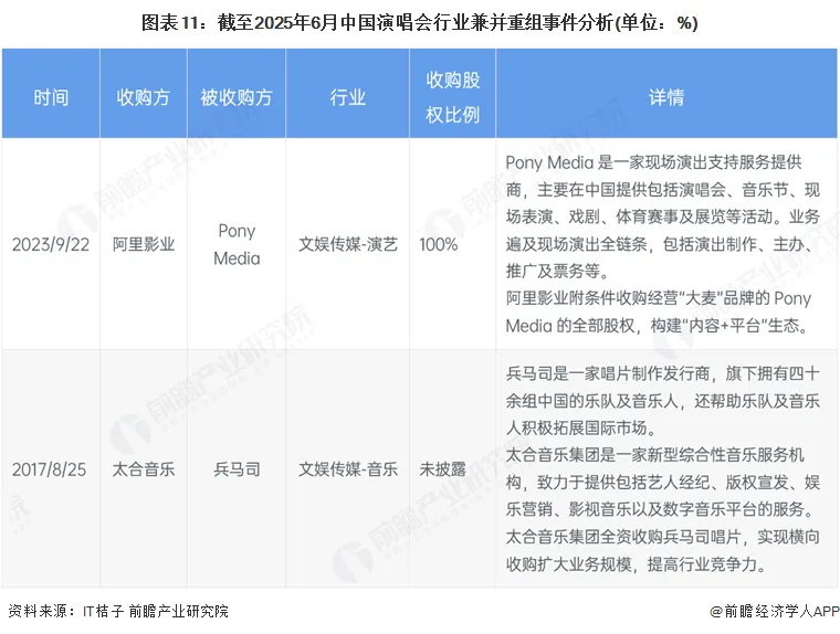 中国演唱会行业兼并重组事件较少。据IT桔子查询仅两起并购事件,2017年太合音乐横向收购兵马司,上游领域的横向扩张,提高市场竞争力;2023年阿里影业附条件收购经营“大麦”品牌的Pony Media的全部股权,构建演唱会“内容+平台”生态。