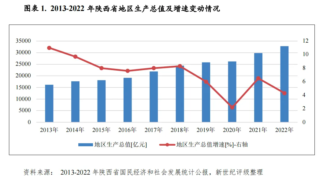 陕西省位于中国西北内陆,具有承东启西、连接西部的区位之便。作为全国重要的重工业基地,陕西省能源化工、装备制造和有色冶金等传统产业较为发达,经济总量在全国处于中等水平。2022年陕西省实现生产总值3.28万亿元,全国各省(区、市)排名第14位;人均地区生产总值8.29万元,低于全国水平。2022年陕西省积极扩大有效投资,狠抓项目建设,充分发挥政策性开发性金融工具和专项债拉动作用,全年全社会固定资产投资同比增长7.9%。随着一系列扩内需促消费政策的持续发力,陕西省消费市场总体呈稳定恢复态势,全省全社会消费品零售总额1.04万亿元,同比增长1.5%。2023年前三季度,陕西省实现地区生产总值2.37万亿元,同比增长2.4%。