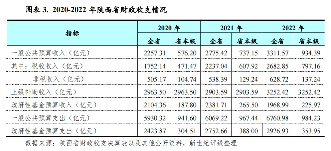 财政实力:一般公共预算收入是陕西省财力的重要构成,其中税收收入占比较高,财政稳定性较好。受益于经济稳定恢复、煤炭价格高位运行,带动榆林等能源资源地区增收较多,2022年全省实现一般公共预算收入3311.6亿元,收入规模居全国17位,与上年排名一致,同比增长19.3%;全年全省实现各项税收收入2682.85亿元,同比增长19.9%,税收比率为81.0%,较上年提升0.4个百分点。但全省财政自给能力一般,财政平衡对上级补助依赖持续较大。2022年全省一般公共预算自给率为49.0%,当年陕西省获得上级补助收入3252.42亿元,对政府财力贡献较大。陕西省政府性基金收入规模处于全国各省级行政区中等水平。2022年全省实现政府性基金预算收入1968.99亿元,同比下降17.5%;其中主要受房地产市场下行导致土地出让减少影响,全年全省实现国有土地使用权出让金收入1592.26亿元,同比下降16.8%。2023年前三季度,陕西省一般公共预算收入保持增长,政府性基金预算收入仍延续下跌趋势。
