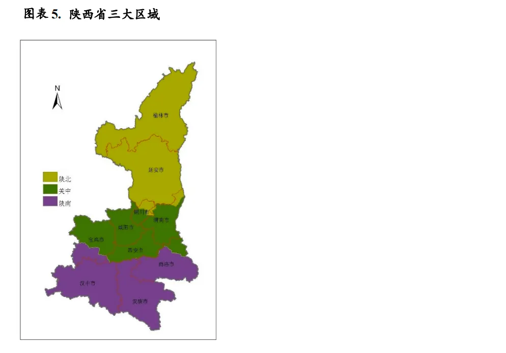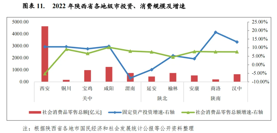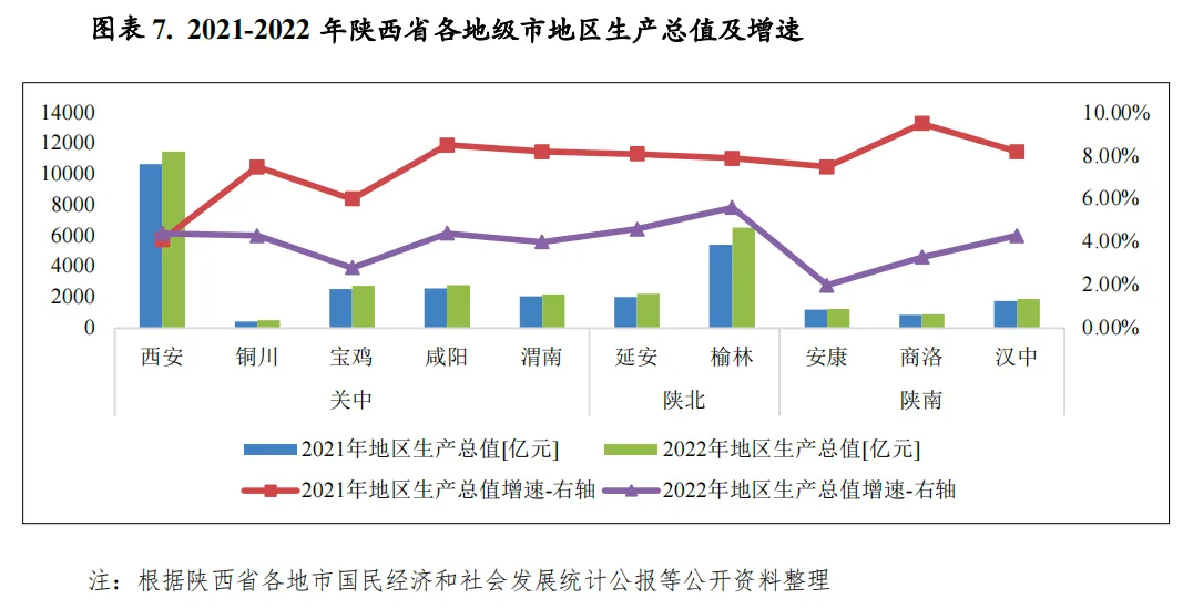 陕西省三大地区资源禀赋略有不同,经济发展呈现分化格局。关中地区产业门类较为丰富,支柱产业囊括高新技术、装备制造、有色冶金、能源化工、食品加工等行业,2022年关中地区生产总值占全省地区生产总值60.8%,系全省经济的中坚力量;其中西安市生产总值为1.15万亿元,约占全省地区生产总值的三分之一,在全省经济规模中处于绝对领先地位。陕北地区的榆林和延安两市均为典型的资源型城市,以煤炭采选和石油天然气开采为支柱产业,2022年生产总值占全省的26.8%,其中榆林市地区生产总值省内排名第二。陕南地区工业发展较为落后,经济体量较小。从经济增速来看,2022年陕西省仅西安市经济增速实现正增长,其余地市经济增速由于疫情影响均呈现不同程度下滑,降幅在2.3-6.2个百分点之间;榆林和延安两市凭借良好的能源资源禀赋,经济增速位居前两位,分别为5.6%和4.6%,其余地市经济增速分布在2.0%-4.4%区间。2023年上半年度,陕西省各地市经济体量差异仍较大,其中西安、榆林仍位居前两位,规模大幅超过其余地市;安康市经济呈现负增长,其余地市经济均保持不同程度增长。