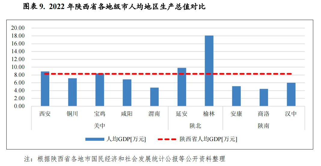 陕西省人口大部分分布于关中地区。截至2022年末,关中地区常住人口占全省常住人口比重为65.7%,陕北和陕南地区人口相对稀少,常住人口占全省常住人口比重分别为14.9%和19.4%。陕北的榆林和延安两市人均生产总值最高,分别为18.08万元和9.84万元;西安市作为经济强市及人口第一大市,2022年人均生产总值为8.88万元,位列全省第三,对全省人均生产总值正向拉动作用较强;关中地区的渭南以及陕南三市经济发展水平较低,人均GDP均不足6万元,其中商洛市和渭南市最低,分别为4.46万元和4.76万元。