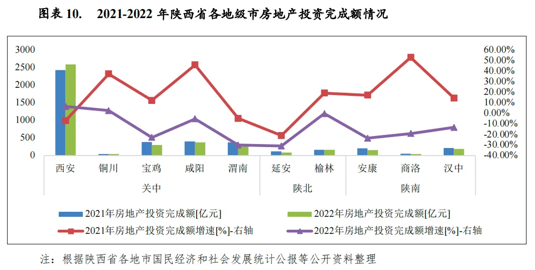 从陕西省经济发展的动力结构看,固定资产投资作用最强,消费次之;作为典型的内陆省份,进出口对当地经济的拉动作用较为有限。2022年,渭南和延安两市固定资产投资出现下滑,分别同比下降7.8%和2.9%,其余地市固定资产投资均呈正增长态势,其中商洛和汉中增速最高,分别为19.0%和13.3%,其余地市投资增速在3.5%-10.8%之间。房地产投资规模主要与当地人口、收入及经济发展情况正相关。2022年以来由于房地产市场下行影响,房地产投资减弱。陕西省房地产投资主要集中于西安市,2022年全市完成房地产开发投资2585.39亿元,同比增长6.5%,对全省房地产开发投资总额的贡献过半。其余地市除铜川外,房地产开发投资均为负增长,其中关中地区的咸阳、宝鸡和渭南在西安房地产溢出效应影响下,房地产市场开发规模较大,2022年三市房地产开发投资分别为377.45亿元、296.21亿元和264.62亿元,增速分别为-5.2%、-22.9%和-30.0%。其余各地级市房地产投资额普遍较小,在40-190亿元不等,其中商洛市规模最小,仅为45.38亿元。
