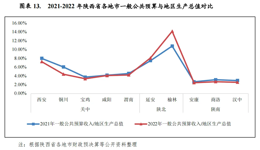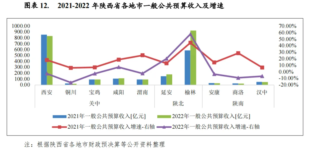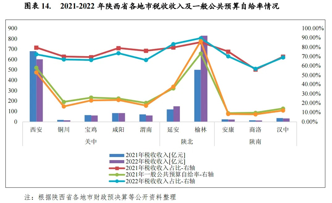由于经济发展水平各异,陕西省各地市一般公共预算收入差距较大,榆林和西安两市一般公共预算收入规模大幅领先于其他地市,占全省各市一般公共预算收入合计数(剔除省本级)的比重合计为74.1%。从收入构成看,榆林和延安因为煤炭资源税相对稳定财政收入质量最高,2022年税收收入占一般公共预算收入的比重分别为89.8%和83.4%;从一般公共预算自给率看,除榆林市该比率达到86.6%外,其余各地市一般公共预算收支平衡能力总体处于较低水平,对上级补助收入的依赖性较高。