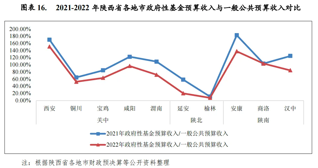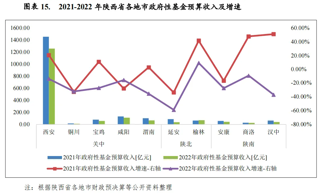 陕西省下辖各地市政府性基金预算收入规模差异较大,2022年西安政府性基金预算收入规模仍独占鳌头,为1262.94亿元;咸阳市主要受益于西安房地产溢出效应,当年政府性基金预算收入超过100亿元,达到112.17亿元;其余地市政府性基金预算收入均未超过73亿元。从增速来看,由于房地产行业景气度不佳使得土地出让市场受挫,2022年陕西省下辖各地市中仅榆林市政府性基金预算收入实现正增长,当年增速为9.6%。其余地市均呈现不同程度的下滑,其中延安市下滑幅度最大,为-58.7%。从政府性基金预算收入与一般公共预算收入规模比较来看,西安、安康和商洛该比例超过100%,政府性基金预算收入对地方财力的贡献度较大,榆林市该比率仅为7.8%,地方财力对政府性基金预算收入的依赖度最低,其余地市分化明显。