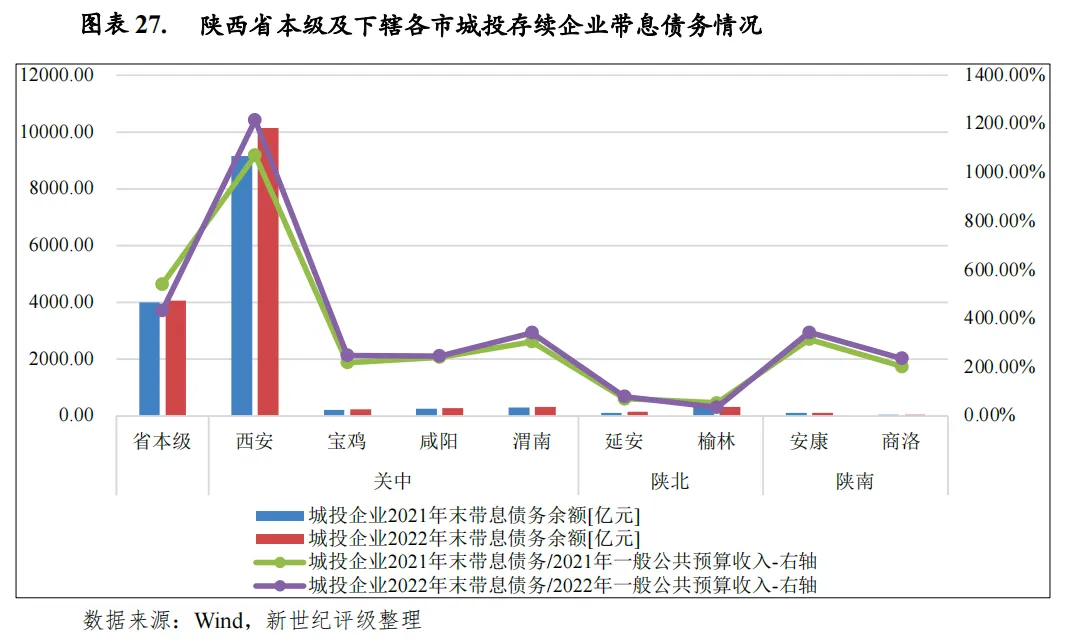 从债务分布看,2022年末陕西省地方政府债务余额仍主要集中于西安,占比约37%,其余地市规模相对较小。从增速看,各地市2022年末政府债务余额均呈现较大增幅;以2022年末政府债务余额与当年一般公共预算收入相比来看,陕西省大部分市县债务负担较重,经济及财政排名垫底的陕南地区债务压力尤为突出。从存续期城投债的地区分布情况来看,陕西省存续期城投债发行主体主要集中于西安和省本级;从城投债余额与一般公共预算收入的比值来看,西安、渭南和咸阳城投债偿付压力较大;从城投企业2022年末带息债务与2022年一般公共预算收入的比值来看,西安该比率达到1215.87%,偿债压力很大,其余地市到期债务偿付压力尚可。