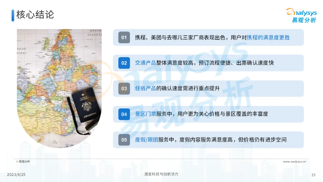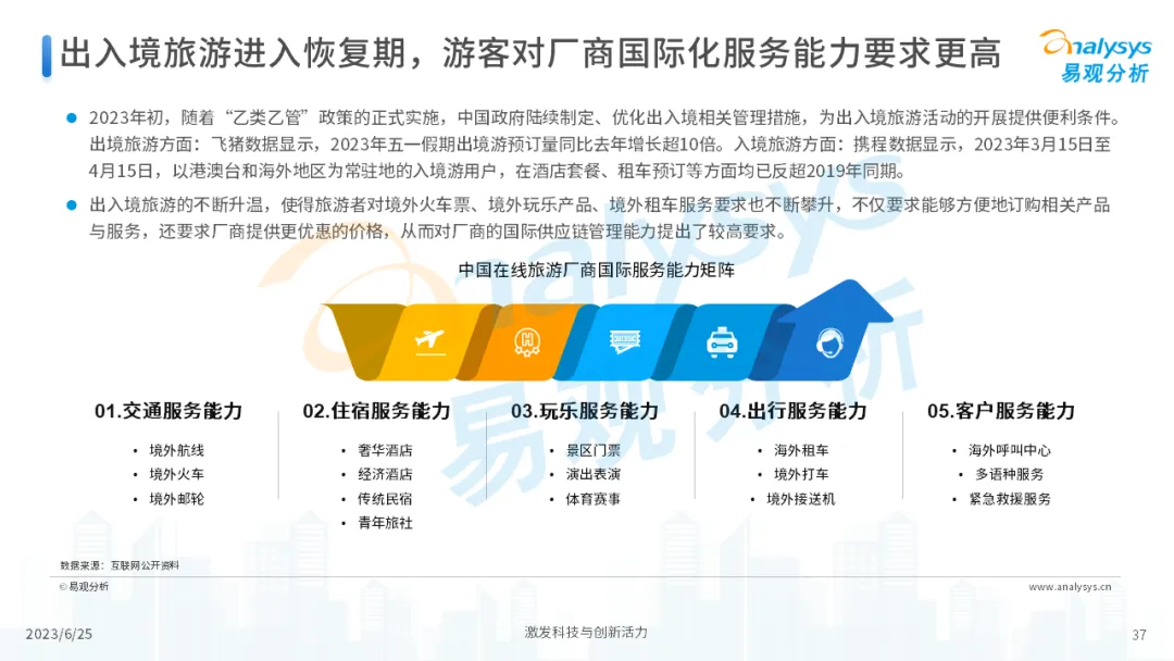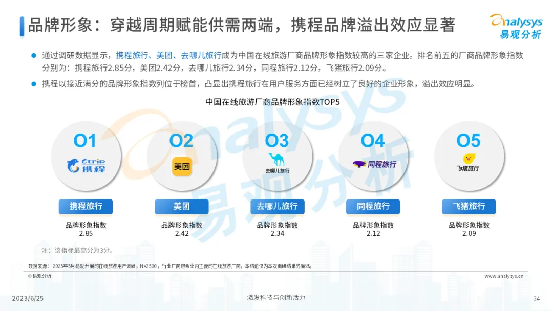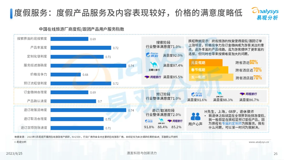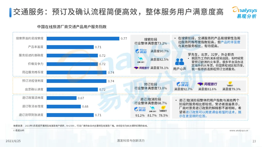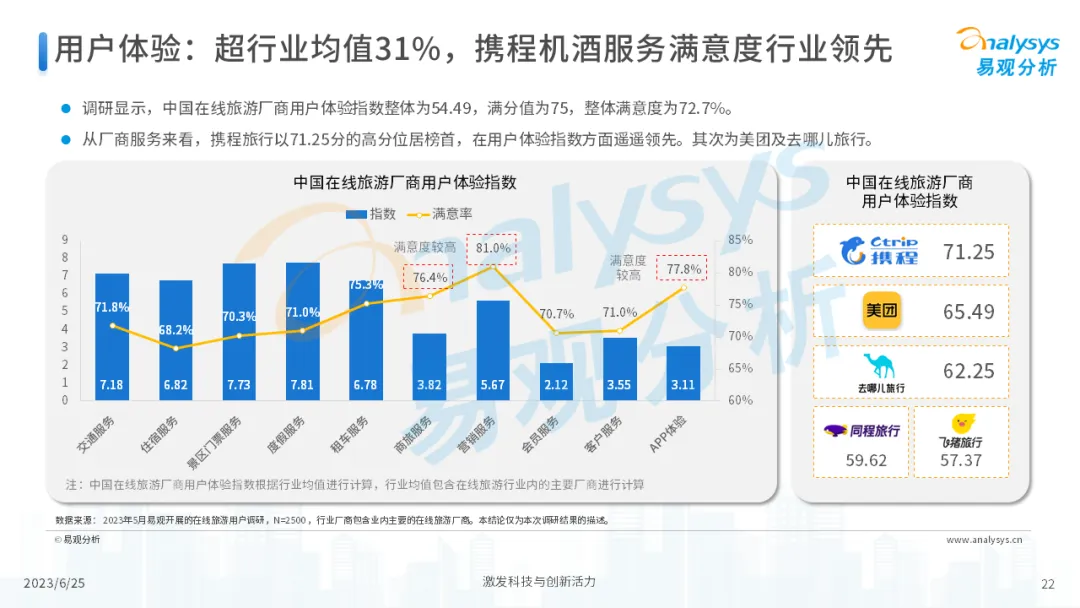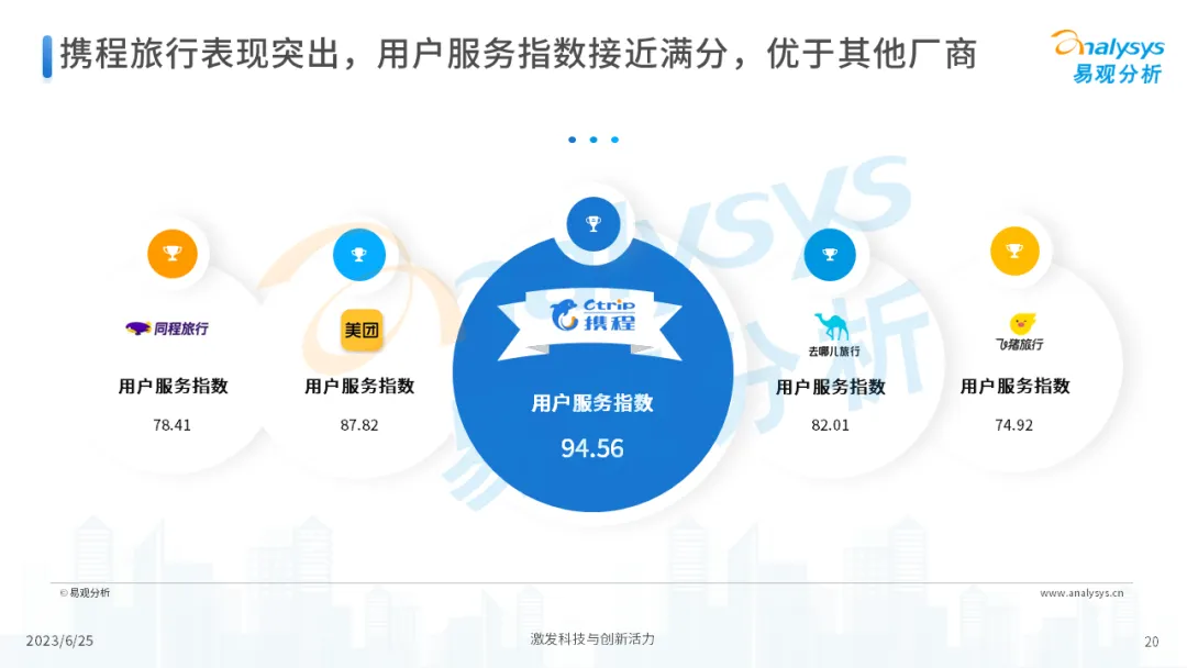 易观分析:旅游本质上是一种服务,高品质的旅游服务为旅游者带来更加安全与舒心的旅游感受,旅游服务成为衡量在线旅游厂商的重要指标。易观分析特构建旅游用户服务指数体系,以此衡量中国在线旅游厂商的旅游综合服务价值。指标分为用户体验、线上运营与品牌形象三大内容,包含11个大类,88项详细评价内容。本次报告易观分析针对2500位旅游者进行调研,了解旅游者对中国各大在线旅游厂商服务能力的评价。调研发现,不管是在用户体验、线上运营,还是品牌形象方面,携程旅行都呈领先态势。此外,旅游者对旅游厂商的综合服务能力更加看重;随着旅游业的恢复,出入境旅游也逐步升温,游客对厂商国际化服务能力要求更高;旅游者对营销服务的认可度比重不断增加;会员权益成为旅游者关注的焦点;售后服务保障能力将成为在线旅游厂商新的护城河。