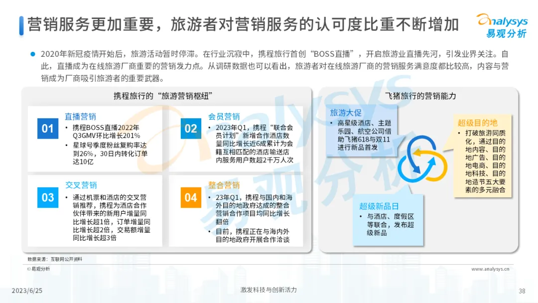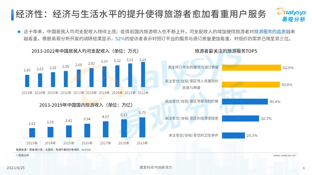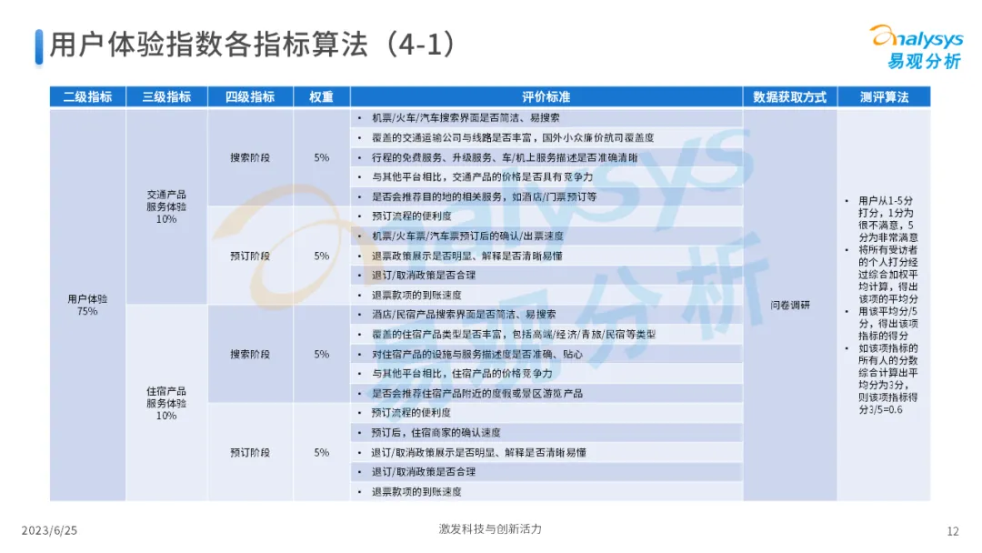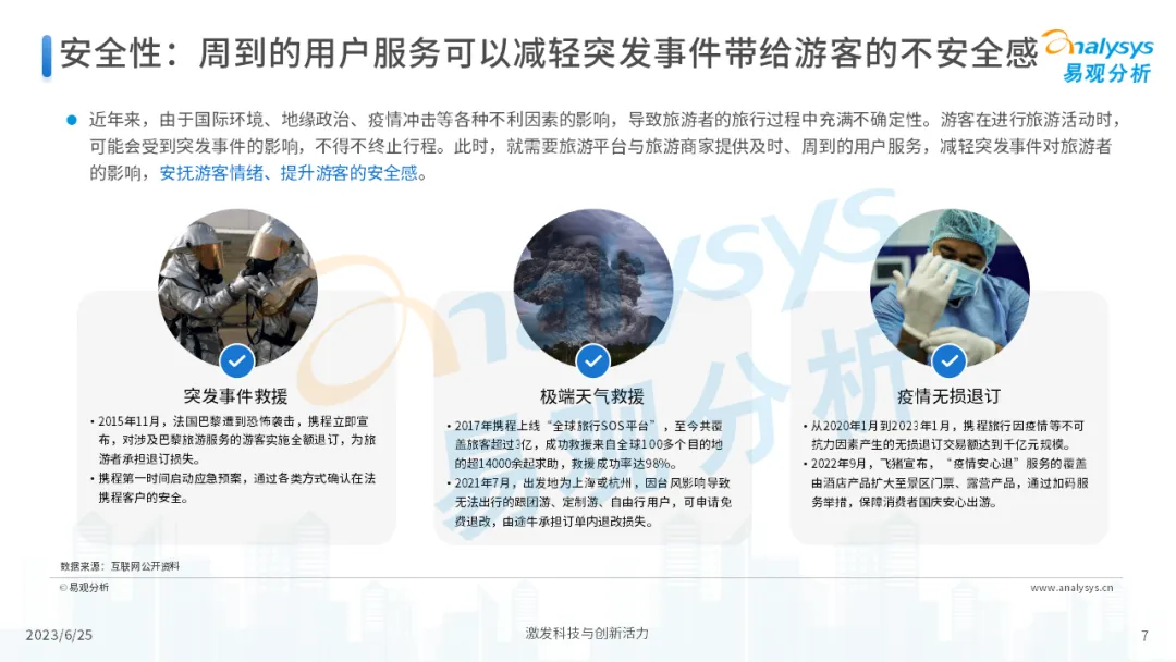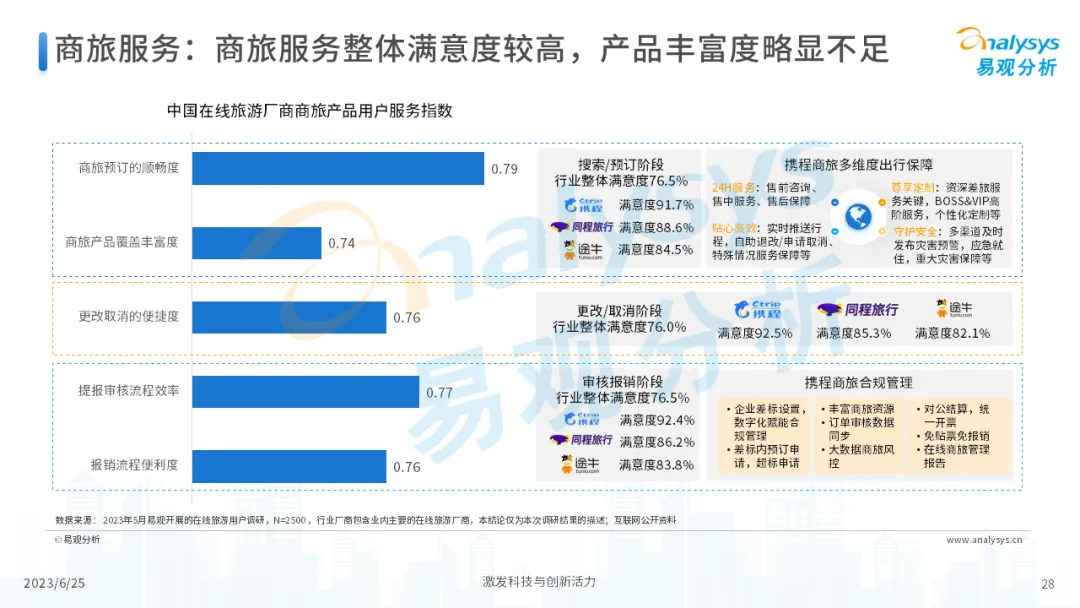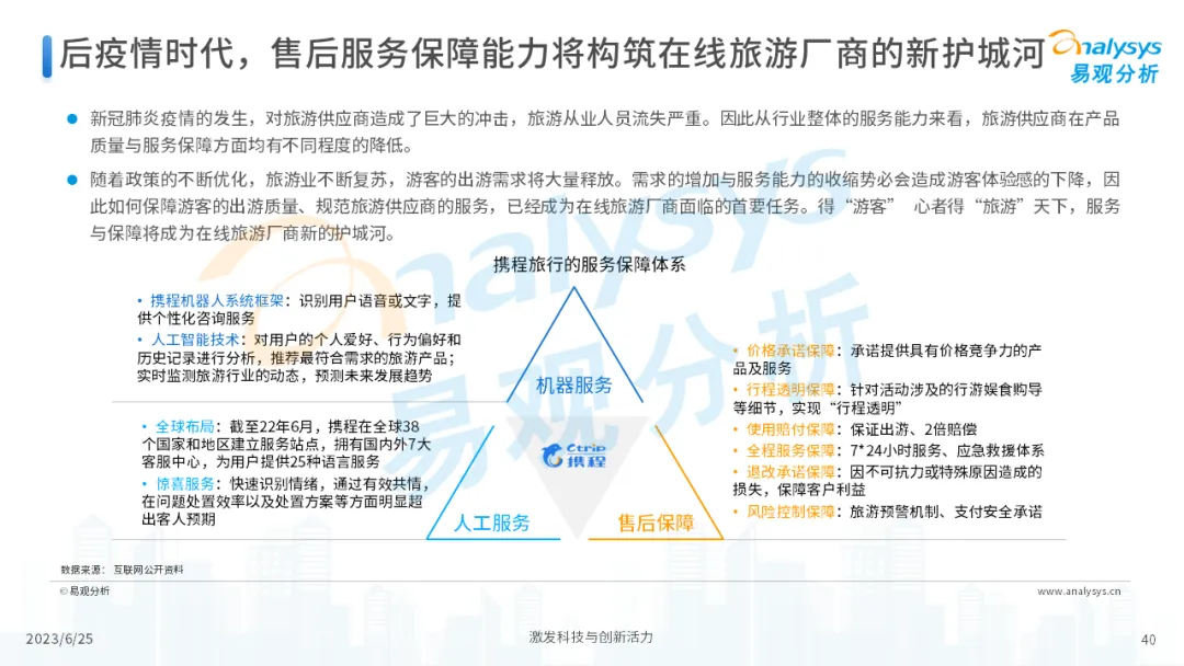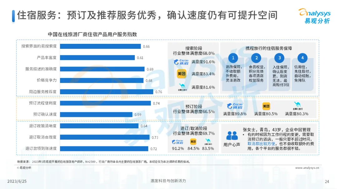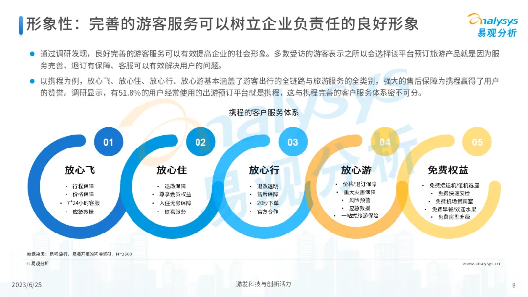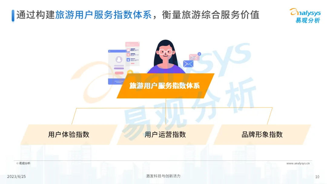 易观分析:旅游本质上是一种服务,高品质的旅游服务为旅游者带来更加安全与舒心的旅游感受,旅游服务成为衡量在线旅游厂商的重要指标。易观分析特构建旅游用户服务指数体系,以此衡量中国在线旅游厂商的旅游综合服务价值。指标分为用户体验、线上运营与品牌形象三大内容,包含11个大类,88项详细评价内容。本次报告易观分析针对2500位旅游者进行调研,了解旅游者对中国各大在线旅游厂商服务能力的评价。调研发现,不管是在用户体验、线上运营,还是品牌形象方面,携程旅行都呈领先态势。此外,旅游者对旅游厂商的综合服务能力更加看重;随着旅游业的恢复,出入境旅游也逐步升温,游客对厂商国际化服务能力要求更高;旅游者对营销服务的认可度比重不断增加;会员权益成为旅游者关注的焦点;售后服务保障能力将成为在线旅游厂商新的护城河。
