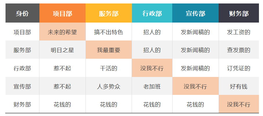 表2-不同部门中的彼此:X部(列)眼中的Y部(行)