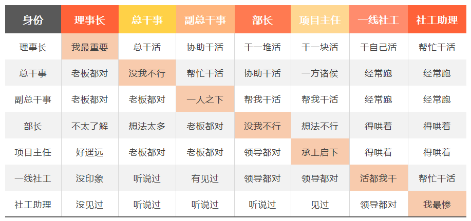 其他行业都有各种鄙视链,社工行业呢?站在价值正确的角度,社工行业里当然没有鄙视链,只是职责分工不同而已。今天就来聊聊社工行业彼此眼中的彼此。