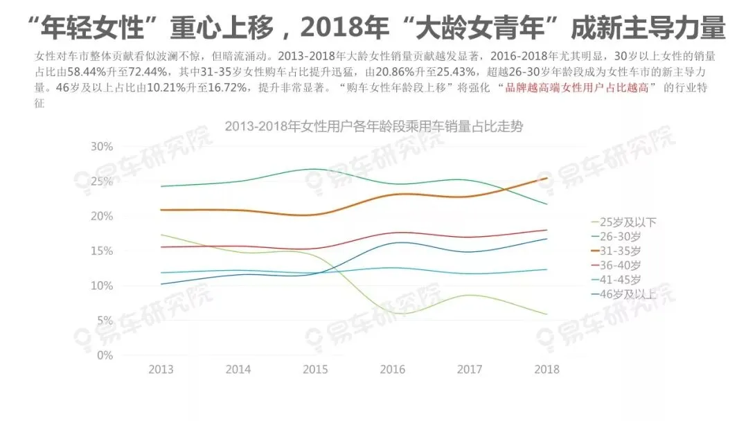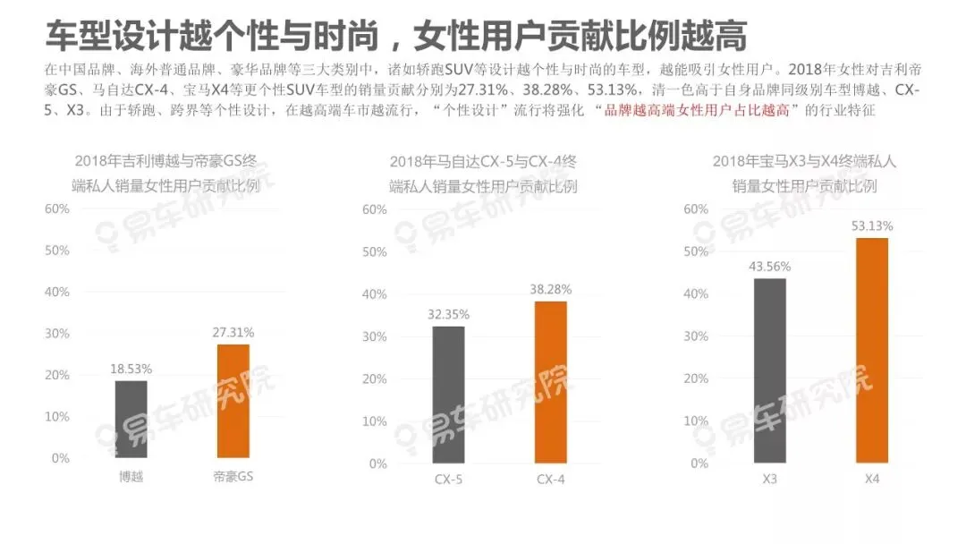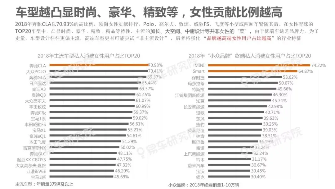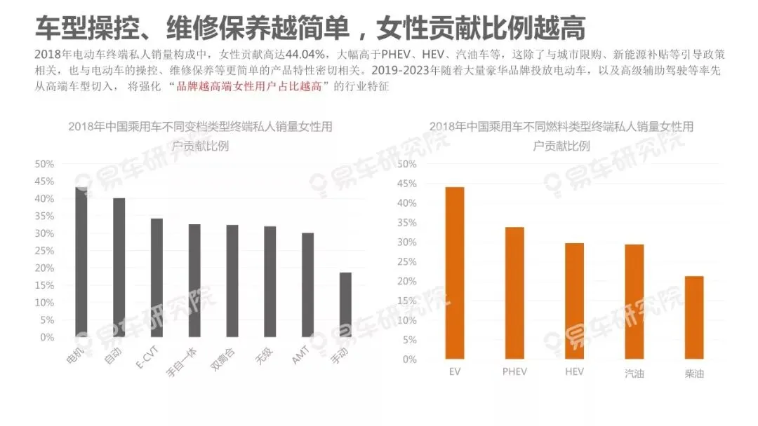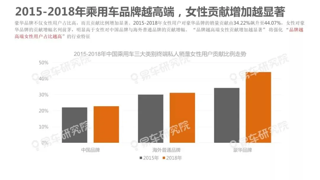 的鲜明特征。该现象不仅部分揭秘了近几年豪华品牌快速上量、海外普通品牌两极分化、中国品牌高端化步履艰难等的背后原因,也预示着在2019-2023年豪华品牌持续上量、海外普通品牌转型升级、中国品牌高端化的关键阶段,积极争取女性用户将成为车企的核心课题。