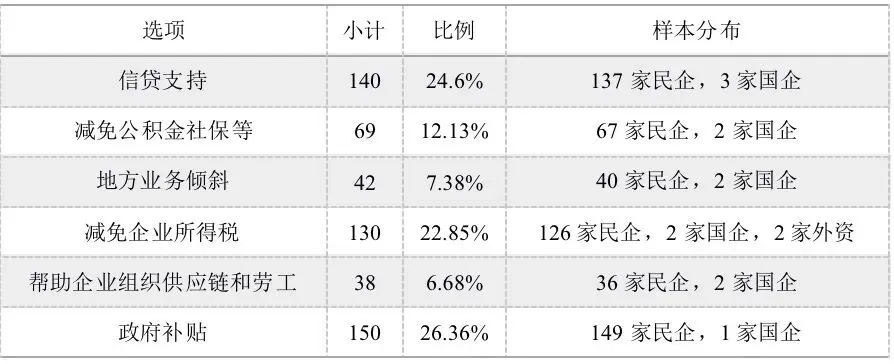 问卷对企业面临的主要困境也进行了调研,表2显示,有超过七成的企业存在资金紧张和经营成本上升的困境,超过五成的企业存在缺乏防疫物资、房租压力过大和员工流失的问题,还有四成的企业反映市场已经被抢占。现金是企业的血液,七成的企业缺乏现金流,其中也不乏许多大型的民营企业。