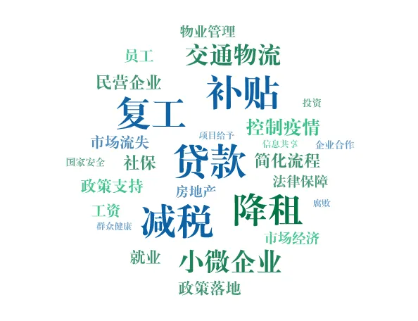 图9为问卷中的两个开放性问题,“您希望政府继续出台怎样的政策扶持企业”和“您还有其他建议或者意见吗”的文本分析词频统计图。从图中我们也可以看到复工、贷款、减税、补贴、降租和恢复交通物流是企业最希望省市党委和政府出台的帮扶政策。