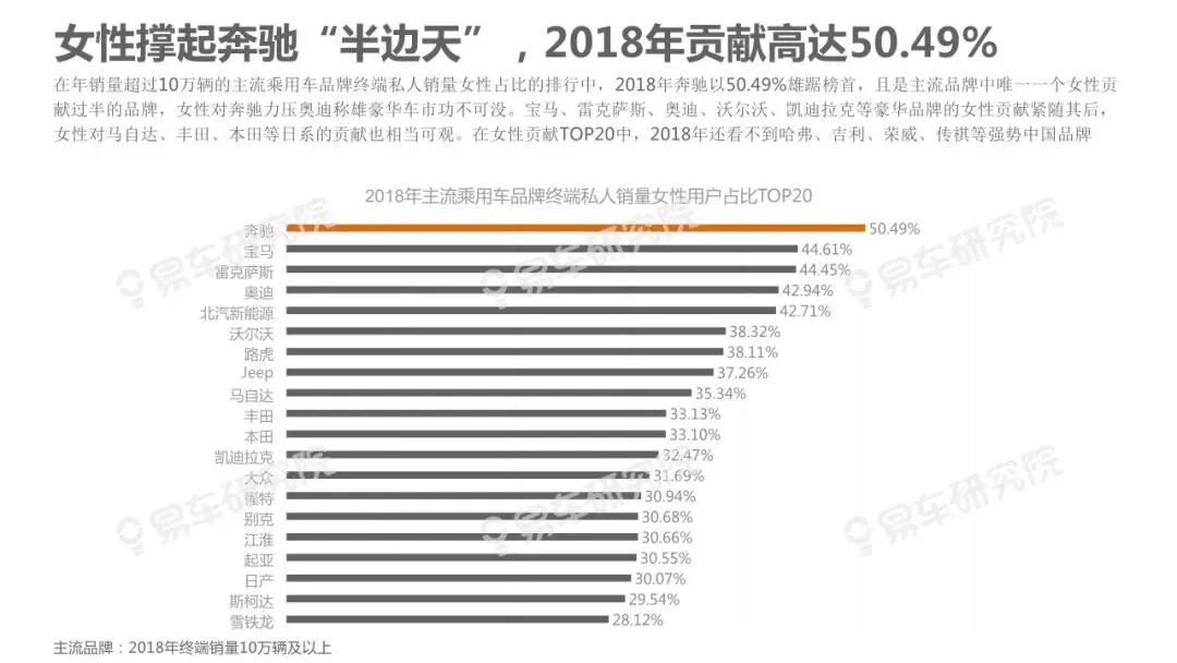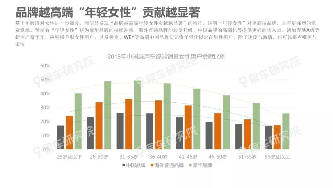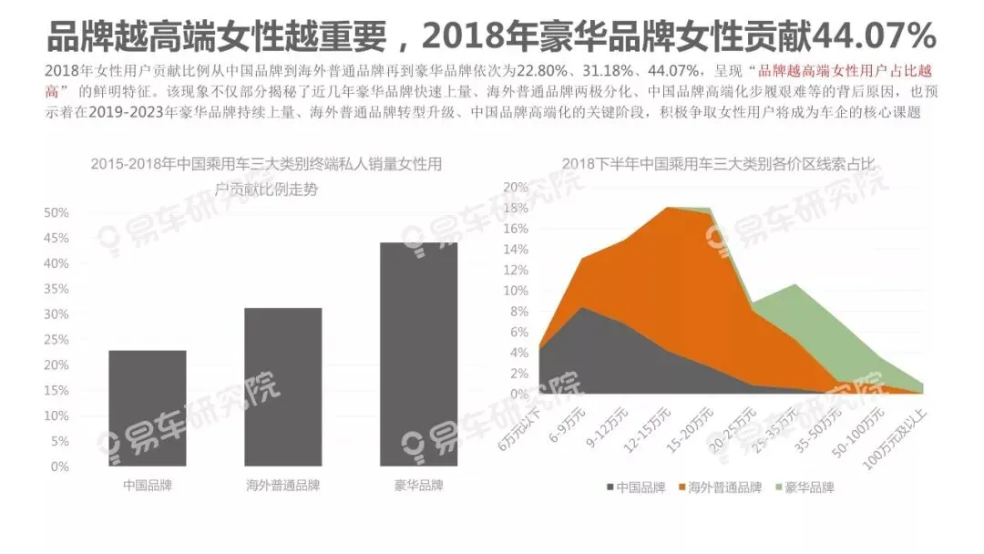 的鲜明特征。该现象不仅部分揭秘了近几年豪华品牌快速上量、海外普通品牌两极分化、中国品牌高端化步履艰难等的背后原因,也预示着在2019-2023年豪华品牌持续上量、海外普通品牌转型升级、中国品牌高端化的关键阶段,积极争取女性用户将成为车企的核心课题。