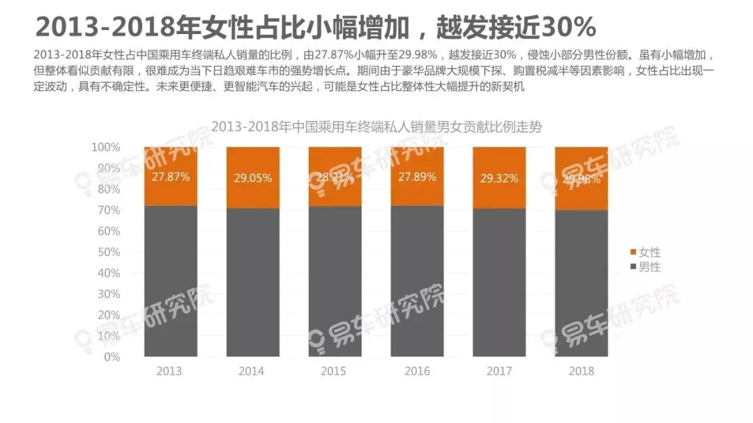 目前中国车市越发艰难,继2018年终端销量同比下滑7.75%,2019年一季度继续下滑5.52%。其中女性用户贡献小幅增加,2013-2018年女性占中国乘用车终端私人销量比例,由27.87%小幅升至29.98%,越发接近30%。