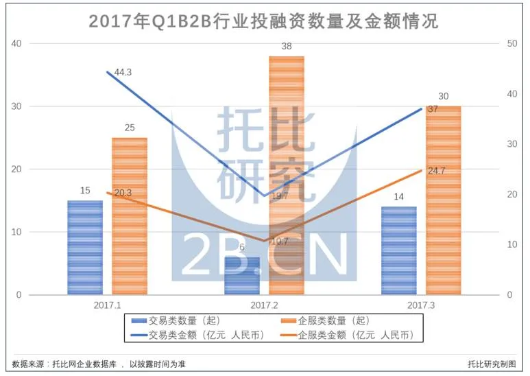 托比网企业数据库显示,2017年一季度B2B行业共发生128起投融资事件,融资总金额超过156.5亿元人民币,托比研究调查发现“吸金最重”与“获投最多”竟然是这两大行业,就是这么火!老铁,这融资没毛病!托比网企业数据库显示,2017年一季度B2B行业共发生128起投融资事件,包括企业服务(以下简称“企服”)类事件93起,企业交易(以下简称“交易”)类事件35起。托比研究对已透露融资金额的117起融资事件进行估值得出,一季度B2B行业共融资金额超过156.5亿元人民币,其中企服类平台获投金额超过55.6亿元人民币(7家未透露),交易类平台获投金额超过100.94亿元人民币(4家未透露)。图一:2017年Q1B2B行业投融资数量及金额情况由图一《2017年Q1B2B行业投融资数量及金额情况》得知,在一季度B2B行业128起投融资事件中,企业交易类事件35起,一月份15起,二月份6起,三月份14起,考虑到2017年2月份春节因素,总体呈现平稳局面;企服类事件93起,一月份25起,二月份38起,三月份30起,总体呈现稳步增长局面。根据图一进一步得知,在一季度B2B行业获得超过156.5亿元人民币的融资金额中,企业交易类平台占据了64.5%的比例,并且在各个月份的获投金额均超过了企服类平台的融资额度。数据表明,在B2B赛道中,“交易型”与“企服型”的商业模式均已受到了资本市场的认可,并且交易型B2B电商平台成为吸金较重的领域,相对而言,企业服务类平台成为获投最多的领域。