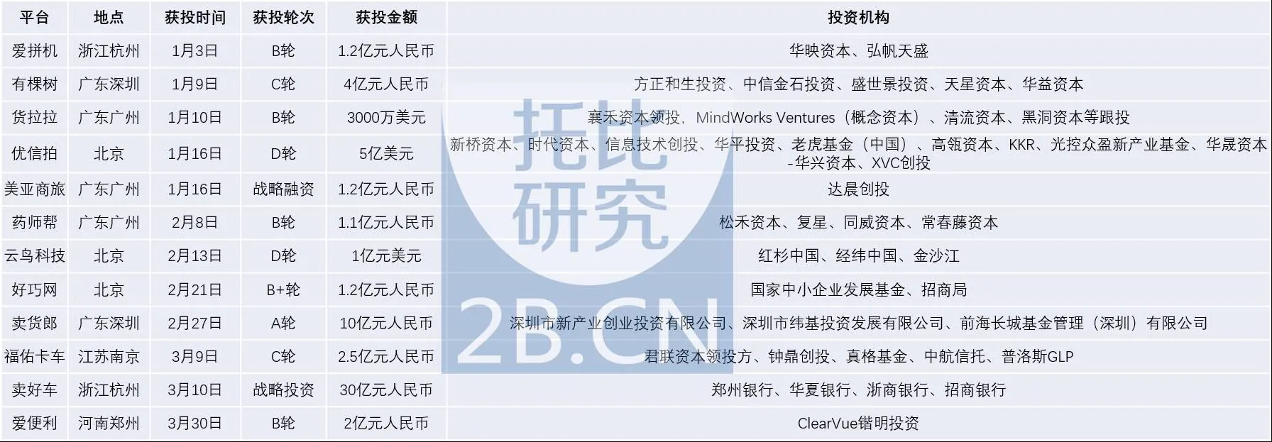 一、吸金较重的交易型B2B电商平台,物流行业成翘楚托比研究发现,这35起交易型B2B电商的投融资事件共涉融资金额超过100.94亿元人民币,其中有12家获投平台的融资额度超过亿元人民币(具体情况参考表一:《2017年Q1获投过亿元的12家交易型B2B电商平台融资况》)。表一:2017年Q1获投过亿元的12家交易型B2B电商平台融资概况这些获投平台共覆盖了旅游、MRO、农业、物流、跨境、建材、钢铁、汽车后、快消、印刷、工业、医药、MICE、房产、化工等15个行业,其所在地域主要以中东部为主,以浙江、广东、江苏、四川等4个省份和北京、上海、重庆等3个直辖市为重点聚集区。托比研究对这些交易型平台的所属行业分别与各个月份和获投轮次进行了关联分析,进一步得出:一季度物流、农业、医药、旅游、MRO等行业发生获投次数较多,其中物流领域发生7次,农业领域发生5次,医药、旅游、MRO等领域分别发生3次(具体情况参考表二:《2017Q1交易类平台获投行业与各月份关联情况》)。表二:2017Q1交易类平台获投行业与各月份关联情况在这些获投的行业中,物流、旅游、汽车后成为获投轮次相对较高的领域(具体情况参考表三:《2017Q1交易类平台获投行业与各轮次关联情况》)。表三:2017Q1交易类平台获投行业与各轮次关联情况据以上分析,物流行业已经成为本年度Q1最受资本方关注的领域。这些获投的物流B2B企业分别是唯捷城配,货拉拉,云鸟科技,福佑卡车,雅澳供应链、好运虎、一智通(具体情况参考表四《2017Q1获投物流B2B企业概况》)。其中需要说明的是,这七家企业分属于不同的细分领域,其主营业务与商业模式也各有差异。比如专注同城配送业务的平台:云鸟科技、货拉拉、唯捷城配;专注城际整车运输业务的平台福佑卡车;提供全国仓储和运输服务的雅澳供应链以及家具行业的物流货代平台一智通;专注于大宗商品物流运输平台的好运虎等等。