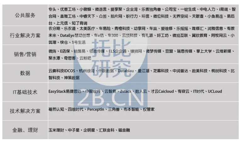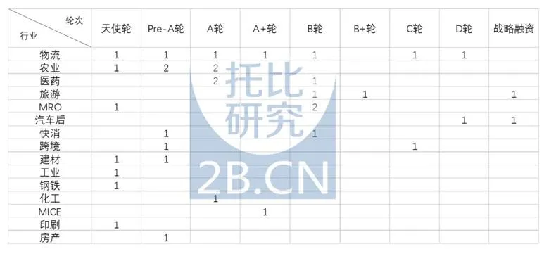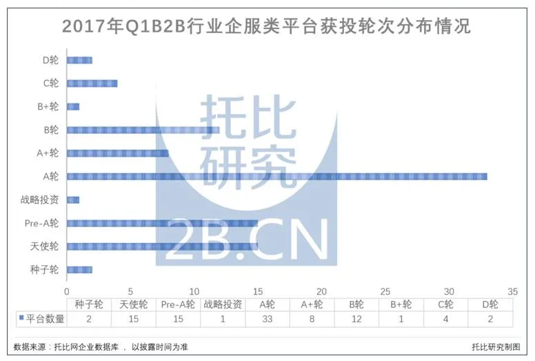 二、获投最多的企服型B2B电商平台,公共服务与IT基础技术领域位居前列托比研究发现,在这93起企服型B2B电商的投融资事件中,虽然共涉融资金额的占比不到40%,但平台的获投数量却占据了整个获投总数的72.7%,成为Q1B2B行业中获投最多的领域。托比研究按照平台服务的业务种类不同,将这93家平台进行了7个领域的划分:公共服务类型,IT基础技术类型,金融、理财类型,数据服务类型,营销/销售类型,技术解决方案类型和行业解决方案类型。另外托比研究对这些平台的总部所在地进行考察发现,这些平台主要集中在北京、广东、上海、浙江等区域,基本上和交易型B2B平台的地理分布保持一致。托比研究对这些企服型B2B平台进行类别划分后,其中公共服务型平台和行业解决方案平台分别以25家、24家的数量成为获投最多的细分领域(具体情况参考表五《2017Q1获投企服类平台与所属领域一览表》)。托比研究对这93家获投企服类企业的轮次情况进行统计后发现(具体情况参考图二《2017年Q1B2B行业企服类平台获投轮次分布情况》),种子轮到A+轮区间共74家,占比近80%,B轮区间13家,C轮4家,D轮2家。其中在IT技术基础服务、销售营销、行业解决方案等三个领域内,平台的获投轮次基本上占据了整个获投轮次的A轮以上,特别是在不同细分领域中出现了较为领先的企服类平台,比如说在IT技术基础服务领域中为企业提供必需的基础IT架构服务(计算资源、存储资源、网络资源)以及解决企业不同场景的业务需求的公有云服务商UCloud;在销售营销领域致力于将企业同客户互动的全过程数字化、智能化, 帮助企业提升客户满意度,实现可持续的业绩增长的销售管理服务商销售易;在行业解决方案领域中较为代表性的有解决医疗信息化方案提供商太美医疗、有提供二手车定价系统的服务商车300、有提供智能仓储解决方案的服务商快仓等等。图二:2017年Q1B2B行业企服类平台获投轮次分布情况托比研究认为,企服类平台获投轮次阶段的靠前分布表明了现阶段企业服务类B2B平台在整体上受到资本青睐的同时,仍然处在百花齐放的局面,其原因有二:一方面随着互联网理念及技术在我国中小企业的商业模式运营中越发成为主体的运营力量有着密切的关联,另一方面在大众创业万众创新的时代背景下,企业服务平台的市场需求度的不断攀升保证了平台诞生与创新的积极性。与此同时,各个细分领域的企业服务平台会在接下去的时间会如雨后春笋般一样涌现,并且竞争格局在近两年内并不会形成。总之,这些平台的现世条件保障了较交易类平台更易获得资本融资进入的发展态势。