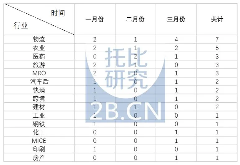 托比研究对这些交易型平台的所属行业分别与各个月份和获投轮次进行了关联分析,进一步得出:一季度物流、农业、医药、旅游、MRO等行业发生获投次数较多,其中物流领域发生7次,农业领域发生5次,医药、旅游、MRO等领域分别发生3次(具体情况参考表二:《2017Q1交易类平台获投行业与各月份关联情况》)。