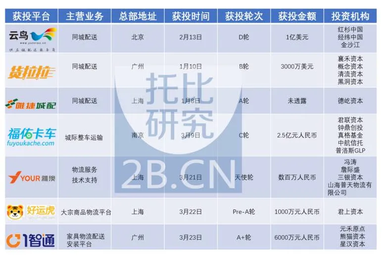 其中需要说明的是,这七家企业分属于不同的细分领域,其主营业务与商业模式也各有差异。比如专注同城配送业务的平台:云鸟科技、货拉拉、唯捷城配;专注城际整车运输业务的平台福佑卡车;提供全国仓储和运输服务的雅澳供应链以及家具行业的物流货代平台一智通;专注于大宗商品物流运输平台的好运虎等等。