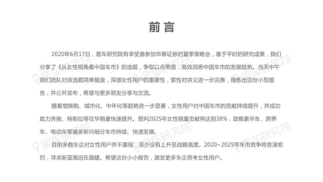 目前多数车企对女性用户并不重视,至少没有上升至战略高度。2020~2025年车市竞争将愈演愈烈,寻求新蓝海迫在眉睫。希望这份小小报告,激发更多车企思考女性用户。