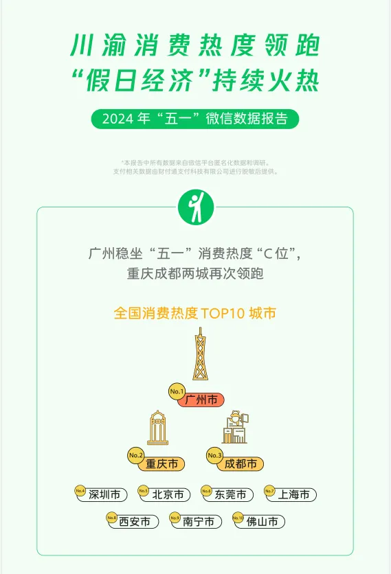 5月5日,微信发布的《2024“五一”数据报告》显示,根据微信支付数据,在全国消费热度TOP10城市中,广州的消费热度位居全国第一。