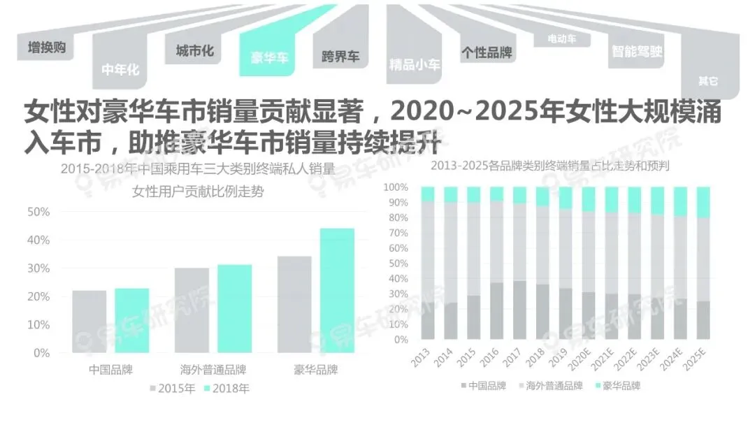 随着增换购、城市化、中年化等趋势进一步显著,女性用户对中国车市的贡献持续提升,并成功助力奔驰、特斯拉等在华销量快速提升。预判2025年女性销量贡献将达到38%,助推豪华车、跨界车、电动车等诸多新兴细分车市持续、快速发展。