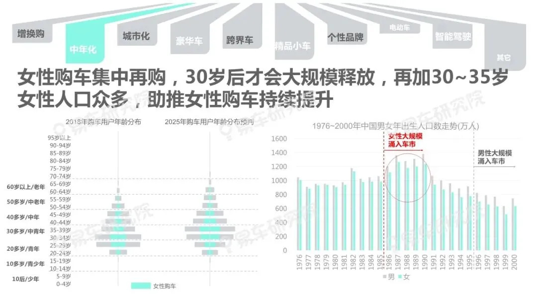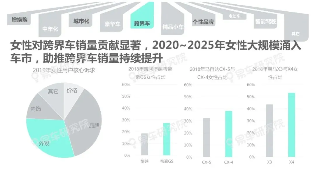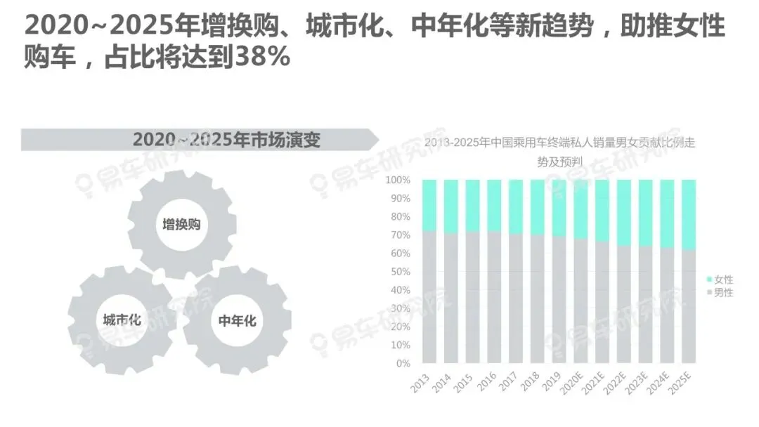 随着增换购、城市化、中年化等趋势进一步显著,女性用户对中国车市的贡献持续提升,并成功助力奔驰、特斯拉等在华销量快速提升。预判2025年女性销量贡献将达到38%,助推豪华车、跨界车、电动车等诸多新兴细分车市持续、快速发展。