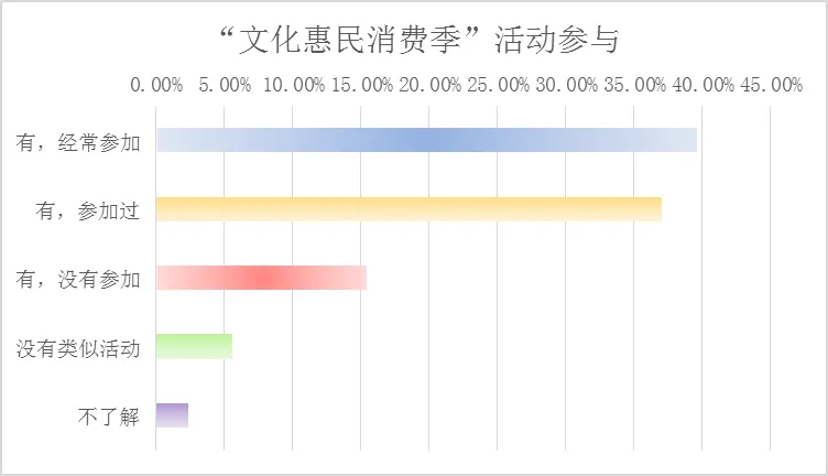 数据来源:中国旅游研究院&上海创图公共文化和休闲联合实验室2019上半年,国内文化休闲基础设施日益完善,各地文化旅游、民俗活动、节庆娱乐等休闲活动精彩纷呈,居民和游客文化消费持续升级,文化体验已经成为提升生活质量和幸福感的重要途径。调查显示,半数以上的受访者表示目前“市场需求旺盛,文化产品能够/基本满足群众需要”。逾七成受访者表示上半年曾参加“文化惠民消费季”等文化休闲活动,其中经常参加的受访者占比近四成。