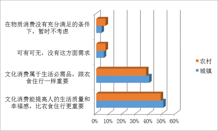 为更好研判文化消费市场总体发展情况和未来走向,系统研究文化消费的市场需求、消费特征、满意度及痛点等方面,中国旅游研究院和上海创图公共文化和休闲联合实验室联合开展了文化消费专项调查研究。通过研究院自主调研平台调查在全国31个省、市、自治区开展城乡居民文化消费调查,收集有效样本15027份。研究认为,文化消费成为国民消费升级的重要标志,文化消费作为满足人们对美好生活的向往、丰富游客深度体验的重要途径,将为旅游经济的持续健康发展提供新的动能。随着居民生活水平的提高和大众旅游的快速发展,人们精神需求不断升级,文化生活成为满足人们美好生活向往的重要支撑,51.78%的受访者认为“文化消费能提高人的生活质量和幸福感,比衣食住行更重要”,38.74%的受访者认为“文化消费属于生活必需品,跟衣食住行一样重要”。