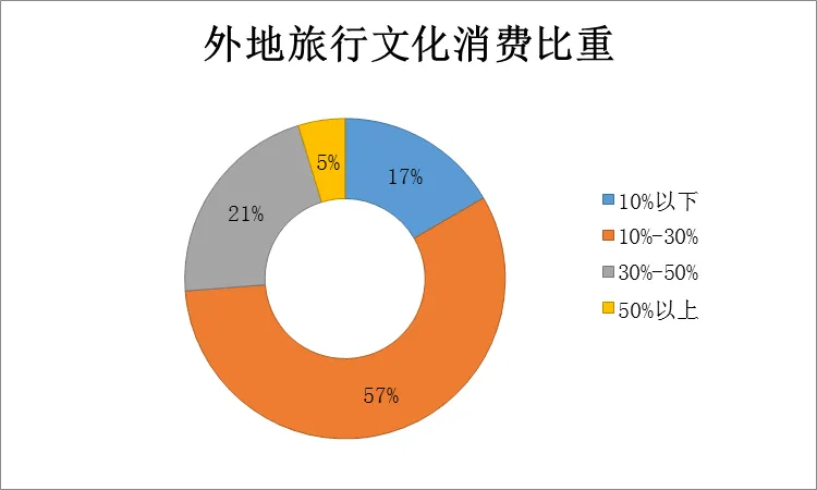 数据来源:中国旅游研究院&上海创图公共文化和休闲联合实验室调查结果显示,大部分受访者均表示2019上半年在外地旅游参加和体验了文化活动,占比超过八成。调查显示,居民在外地旅游时进行文化消费的比重主要集中在“10%-30%”。当下居民旅游消费热情高,未来消费水平和消费质量仍有很大提升空间。