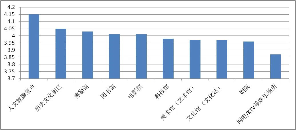 (二)人文旅游景点、历史文化街区、博物馆等满意度较高上半年,本地各类文化消费场馆中,受访者对“人文旅游景点”的满意度评价最高(4.15分),对“历史文化街区”的满意度也较高,(4.05分)。