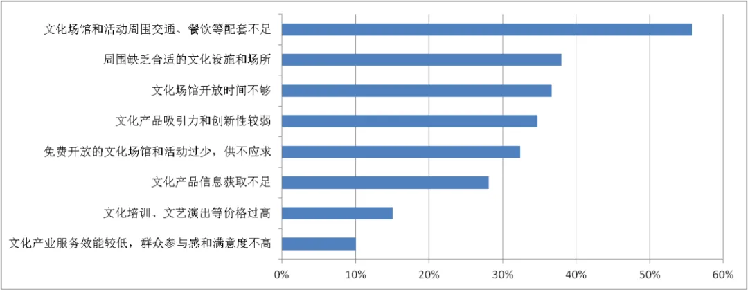 数据来源:中国旅游研究院&上海创图公共文化和休闲联合实验室从城乡居民对比情况来看,城镇居民反映文化设施配套不足、开放时间不足、产品创新不足的比例高于农村,而更多的农村受访者反映文化信息获取不足、免费文化场馆和活动过少、文化消费支出过高等问题。