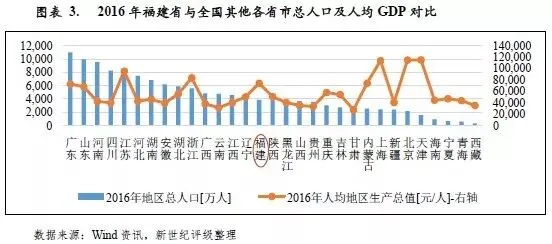 福建省人口在我国各省市中排名中游水平,2016年末常住人口为3874万人,较上年末增长0.91%,占全国总人口的2.80%,丰富的人力资源保障了地方经济发展所需生产力,地方经济增长受人口红利衰减的冲击程度相对较小。2016年,福建省人均地区生产总值为7.40万元,位列各省市第7位,与经济总量相比,排名相对靠前。“十二五”期间,福建省人均地区生产总值年均增长10.75%(未扣除价格因素),按美元计算,已成为全国九个“人均GDP超万美元俱乐部”成员之一。