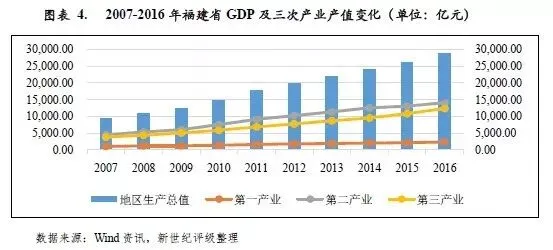 产业结构方面,福建省第一产业总体较为稳定,第二、三产业增加值保持稳步增长态势。作为制造业大省,第二产业在福建省经济中长期占据突出的地位,占GDP的比重一直超过50%。福建省三次产业结构由2007年的11.3:49.2:39.5调整为2016年的8.3:48.8:42.9。福建省第三产业虽然较为分散(批发和零售业2016年增加值占比为17.9%,交通运输、仓储和邮政业占比为13.7%,房地产业占比约为10.3%),但近年来在金融机构拉动下,金融业快速发展,2014~2016年金融业增加值年均增速达13.45%,2016年金融业增加值为1866.17亿元,占第三产业增加值的比例为15.2%。