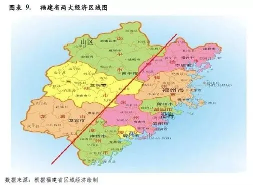 根据福建省自然地理特征和区域发展水平,可将全省划分为沿海地区和内陆山区两部分。沿海地区包括直接临海的福州、厦门、泉州、漳州、莆田和宁德6市,该区域产业基础相对良好,经济发展水平相对较高;山区则包括南平、三明和龙岩3市,产业基础相对较弱。福建省区域经济基本呈现从沿海向内陆递减的经济格局。