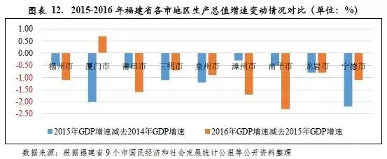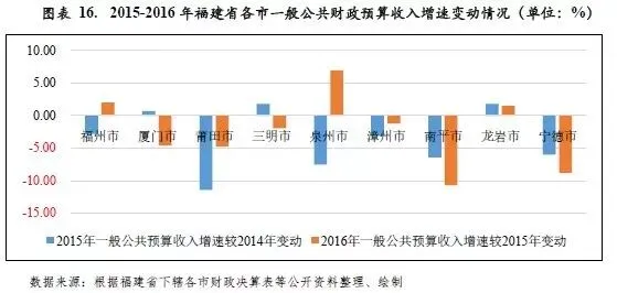 从经济规模来看,福建省区域经济呈现分化格局。泉州、福州、厦门经济总量在全省处于绝对领先地位。其中,2016年泉州实现地区生产总值6646.63亿元,位列全省第一。其余几个地级市龙岩、三明、莆田、宁德和南平的经济规模较小,地区生产总值均未超过3000亿元。从经济增速来看,除厦门市增速较2015年增长0.7个百分点,其他8个地级市增速较2015年均有所下滑。其中,漳州市仍旧保持了较快的增长速度,当年增速为9.3%,远超其他地区。而南平市增速下滑较为显著,增速仅为6.8%,同比下降了2.3个百分点,经济抗风险能力相对较弱。