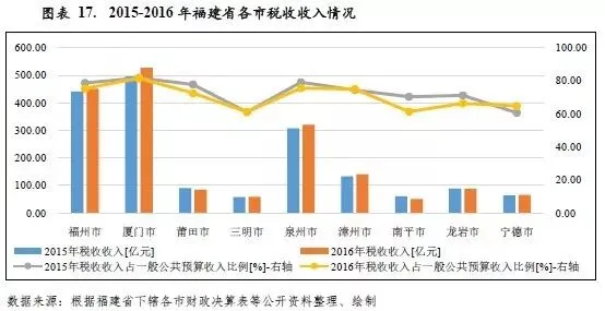 从下辖各地级市情况看,与经济实力相匹配,各地级市一般公共预算收入规模及质量总体与经济发展水平相当。厦门市2016年一般公共预算收入为647.94亿元,规模显著高于其他地区。排名其次的福州市和泉州市一般公共预算收入分别为598.91亿元和424.08亿元,其他地区一般公共预算收入规模普遍偏小。除南平市和宁德市外,各市仍保持了一定的一般公共预算收入增速,但普遍较上年有所下滑。从收入质量看,福建省下辖各市除厦门市税收比率为81.48%外,其他各市税收收入占比均在80%以下,一般公共预算收入质量一般。从收支情况看,部分地区如龙岩市、宁德市、三明市和南平市,仍存在一般公共预算自给率不佳、收支平衡主要依赖于上级补助收入的情况。同年,各地级市基本扭转了2015年政府性基金预算收入大幅下滑的局面,其中福州市和厦门市分别同比增长53.0%和28.8%。