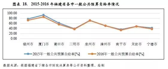 从一般公共预算自给率[3]看,福建省各市2016年一般公共预算自给率较2015年略有下降,但总体相对稳定。福建省沿海各市自给率普遍较高,山区各市一般公共预算收支平衡能力总体处于较低水平。2016年一般公共预算自给率较高的为厦门市、福州市和泉州市,分别为85.41%、72.16%和70.96%,其他各市一般公共预算自给率均低于70%,均对上级转移支付存在不同程度依赖。