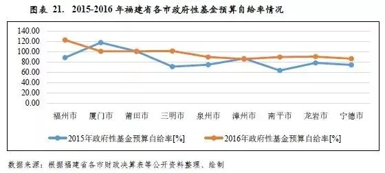 从政府性基金预算自给率情况看,受益于2016年政府性基金收入的增长,当年福建省下辖各市政府性基金预算收入对其支出的覆盖程度均有所提高,2016年政府性基金预算自给率均在80%以上,其中福州市、三明市、莆田市和厦门市政府性基金预算自给率均超过100%,政府性基金收入能够完全覆盖当年的支出。宁德市和漳州市政府性基金预算收入对其支出的覆盖程度相对欠佳,2016年政府性基金预算自给率分别为86.28%和85.69%,具有一定的支出压力。
